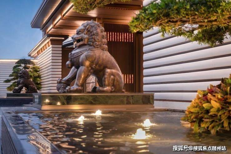 云启玉渚以约68米宽(含景墙)“玉阙九仪”门庭,复刻良渚高台形制,融合庑殿顶规制与玉琮肌理,五步青云阶、铜狮镇守、双涌泉相迎——从归家第一步,便奠定东方仪范。