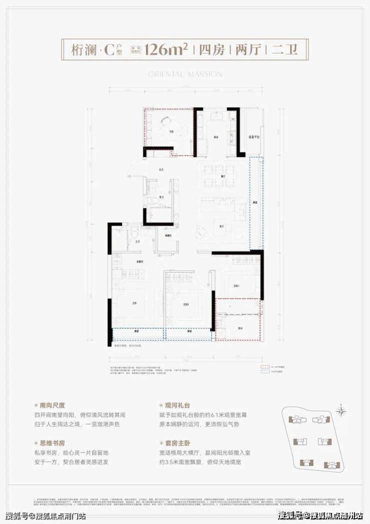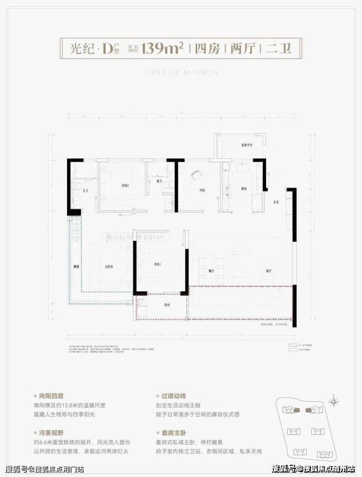139㎡ 四房两厅两卫:高端改善,南向大横厅,主卧 270° 转角窗,尺度舒适。