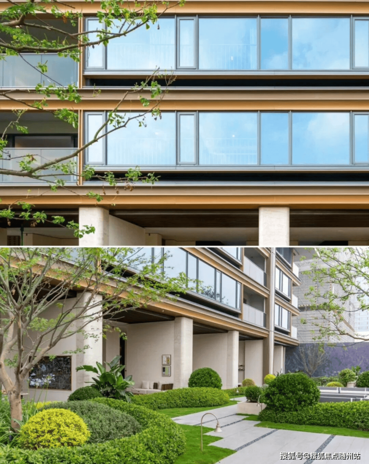 外立面用了大量金色线条,整体风格是暖色调的,不光和周边楼盘形成差异化,在质感上也贵气十足。