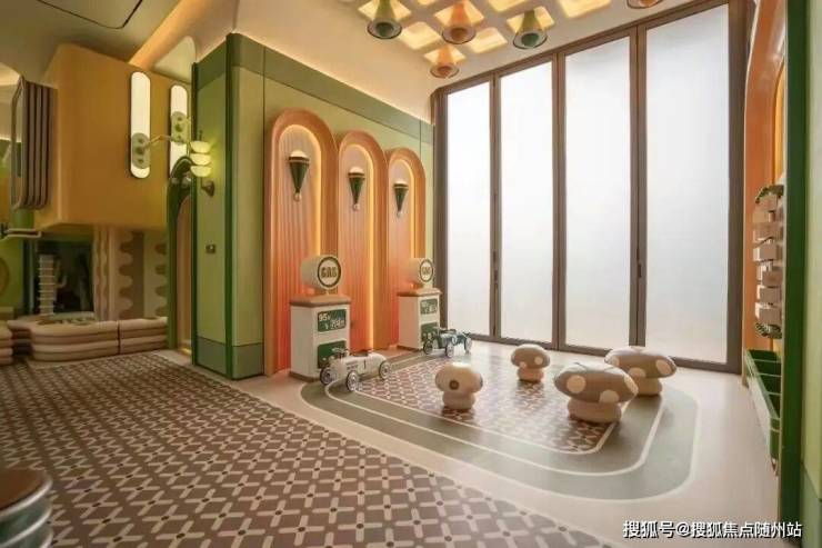 架空层作为新规后的亮点,咏舟府打造了2个童玩主题、老年主题、女性主题等功能空间。6幢的架空层内,labubu主题轰趴馆空间搭配抬升设计特有的城市阳台空间,为城西年轻精英群体量身定制。童玩主题设有滑梯、攀爬架与益智游戏区,色彩明快的设计激发孩子们的创造力。