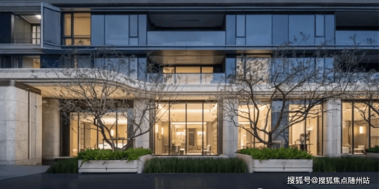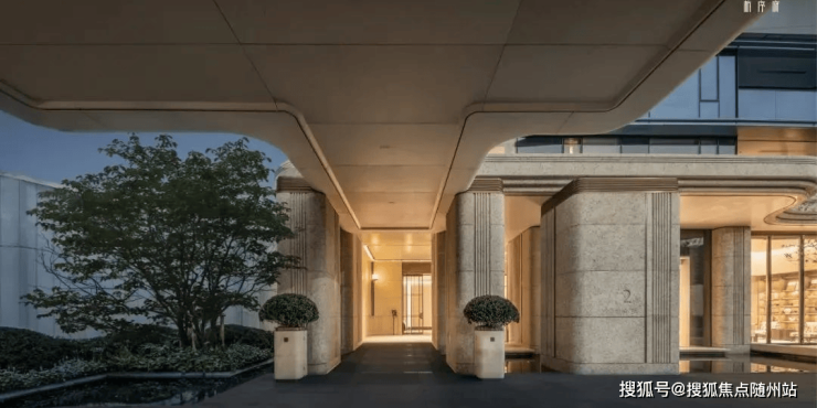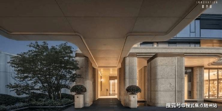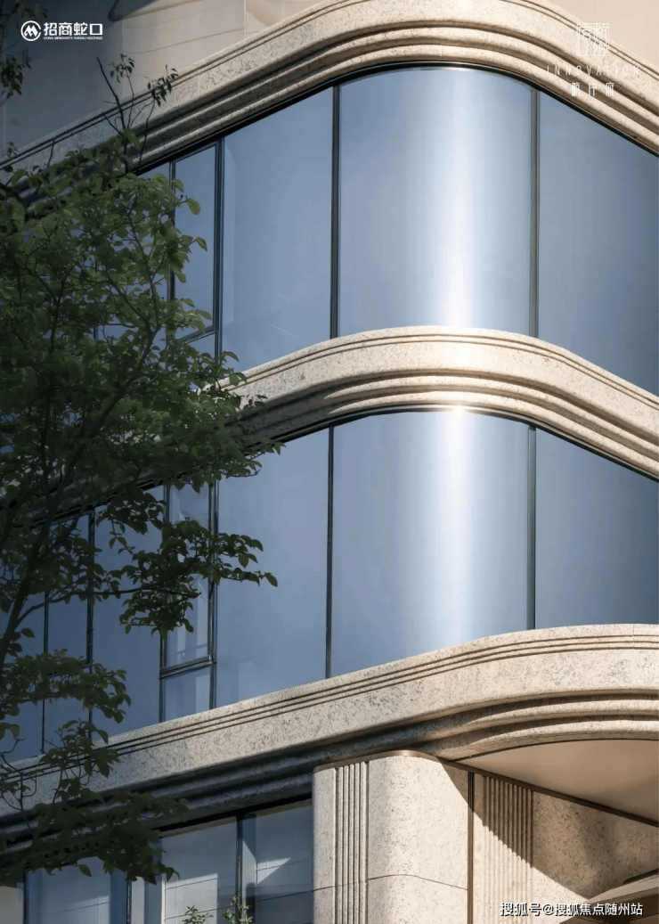南北两侧立面均是超高的窗墙比,并配以大面落地玻璃。层间线条则是铝材和石材的点缀结合,使用了大量的曲面弧形石材。用的还是跟合肥招商玺同款的「双曲倒弧工艺」,成本非常高。
