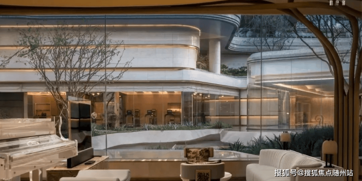 两棵高约14米的“生机之树”撑起三层观景回廊。透过大面落地的苹果店同款超白玻,层层叠石和潺潺流水尽收眼底,仿佛让人置身于九溪烟树的溪水幽谷当中。
