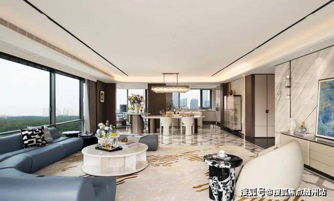 【高层268】客厅选用深灰佩纳深蓝、巴西鱼肚灰大理石等,彰显大宅品质感。