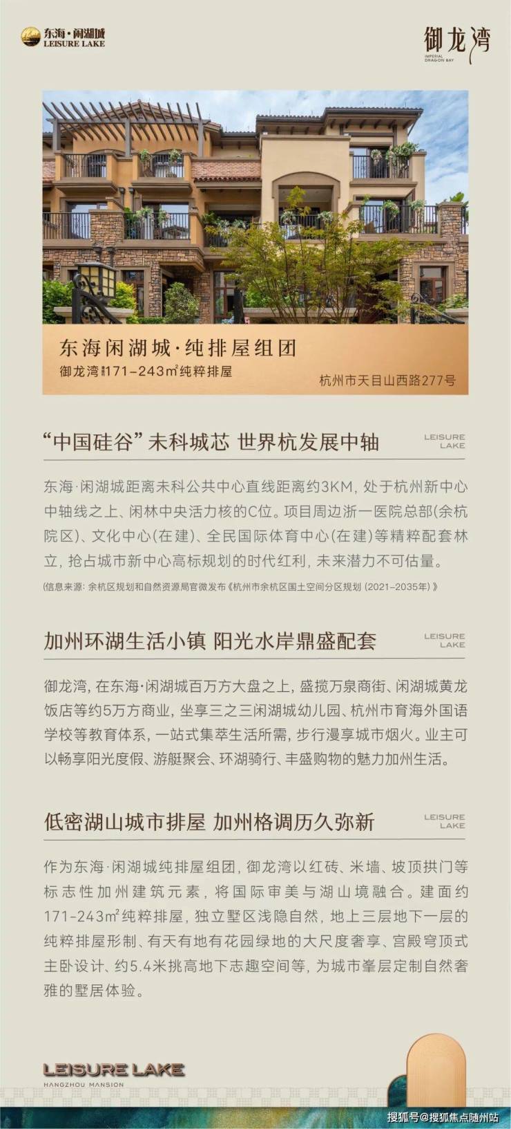 杭州第三中心内具有加州格调、既有高层又有排屋、生活教育设施配套齐全、环境优美沿湖而居的美丽生活小镇「东海·闲湖城」大城已成!纯排屋组团——御龙湾正式交付