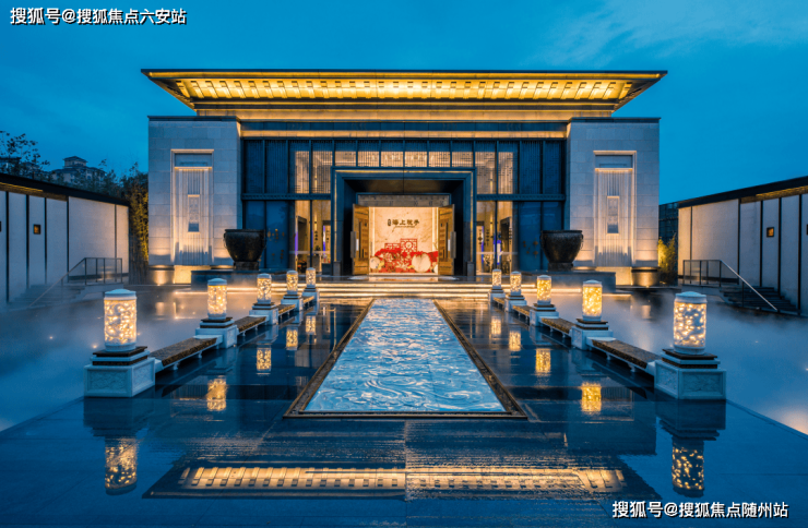 项目复刻北京恭王府规制,打造“三进仪制空间”,主入口宽20米、高8米,采用黄色木纹洞石、汉白玉、黄铜等名贵材料,搭配以《千里江山图》为蓝本的影壁墙,彰显磅礴气势。