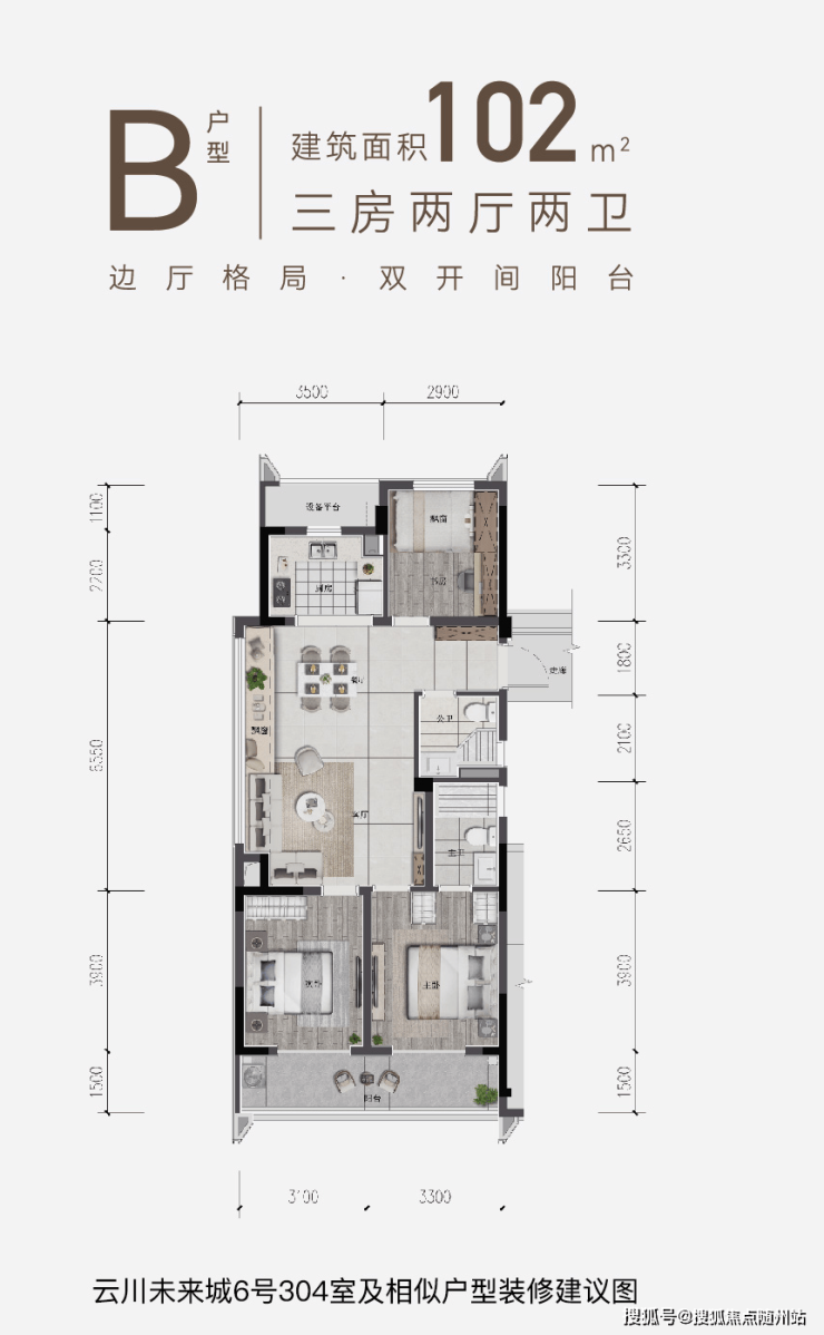 建面约102㎡的三房两厅产品,餐客厅的面宽足有约6.55米,边厅格局可以让阳光透过飘窗打进室内,傍晚时分端一杯红茶坐在沙发上,夕阳光斜射在客厅地板上,意境十足。南向两间卧室还设计了连通长阳台,满足洗衣和晾晒需求的同时还可以摆一对躺椅。