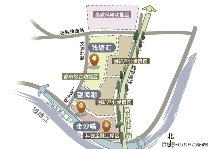 建东部湾新城的核心区域——金沙嘴,是钱塘江城区内的最后一湾,也是东部湾新城三大核心组团之一,片区定位为总部经济为基础的都市CBD,未来将形成企业总部、住宅、商业、公园等超级业态群,是钱塘区重点发展的标志性区域。