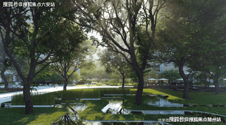 碍于平面空间有限,POK就在垂直空间上动起了心思,让局部平地变得蜿蜒起伏,做出了一个生动而有立体感的园林,想想就有趣极了。疗愈花园、轻氧草坪、林间步道等多个全龄活动场景嵌在了园林里,大面积水景蜿蜒其中,似江流,似白练。