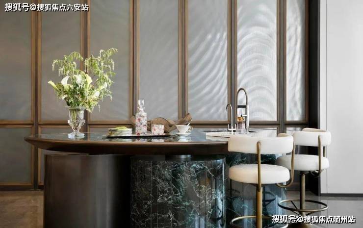 客厅中央 Visionnaire Miller 茶几堪称材质美学典范。台面罕见绿色大理石墨绿底色交织白色脉络,宛如浓缩整片森林生机,与硬装普拉达绿岛台形成色彩呼应,让自然元素在公共区域流转。