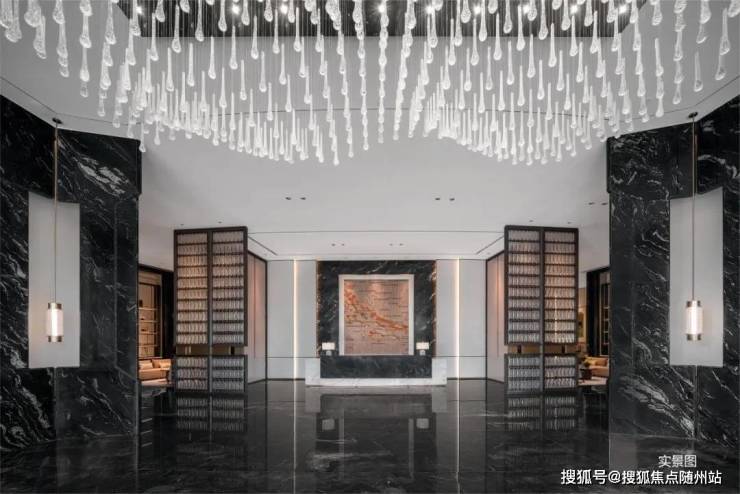 世界的凝视中,艺术常常是流动的,入户大堂中如“波浪”形态的吊灯与 中轴礼序展开的琉璃香槟金屏风 ,光影流转,构成恢宏的门庭礼制空间格局。由无数个水滴构成的巨型水晶吊灯,散发月光般柔和光线,温暖、恬静、富有诗意。一席碧潭金沙,倒映璀璨流光,虚实相生,匹配时代层峯 “上善若水,水利万物” 的生活哲学。