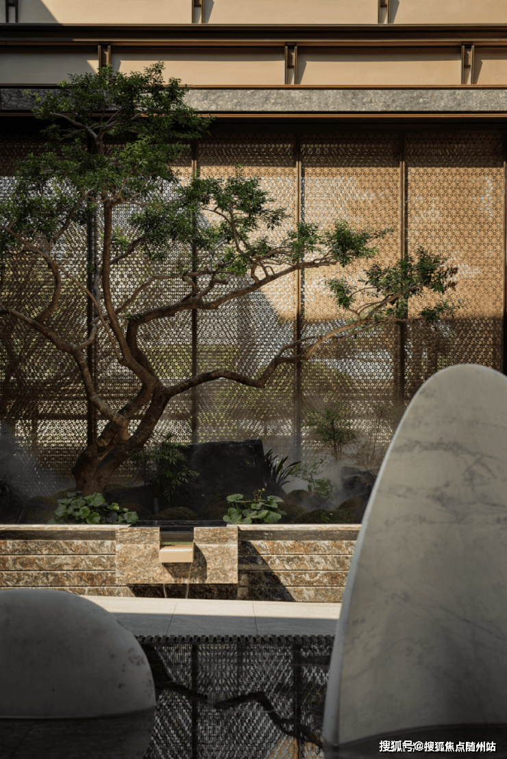 建筑立面采用了石材、大面积玻璃为主要材质;细节之处设计师搭配白色石材和鎏金线条,借鉴蜀山先照寺的重檐叠韵,独创镂空金属格栅,赋予立面吉祥如意,让建筑既是居所,亦是可传世的艺术珍藏。