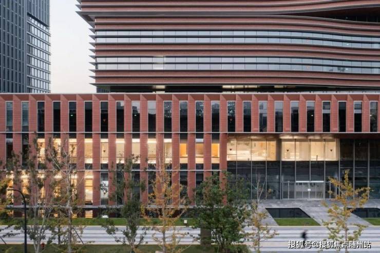 智慧楼高60米,在周边百米高楼群中独树一帜,采用“回”字形水平切分形体,营造刚柔并济的城市标志。建筑外立面延续浙大学院建筑特质,以陶红色为主色调,配以灰白色与香槟金,体现江南水乡的温润气质。底层基座采用红色楔形陶板,呼应浙大文脉,横向白色铝合金遮阳百叶经过精细拟合,使建筑呈现流畅、轻盈的效果。水平百叶线条背衬陶红色穿孔铝板,穿孔板采用渐变流动的细腻纹理,呼应旋转错动的形体。为保证外立面整体美观,建筑采用机械排烟系统,并将开启扇巧妙设置于各层底部,使观景视线保持纯净,同时满足通风需求。屋顶层层跌落,采用香槟金色穿孔铝板,在遮盖屋顶设备同时营造出内院四水归堂的意境。