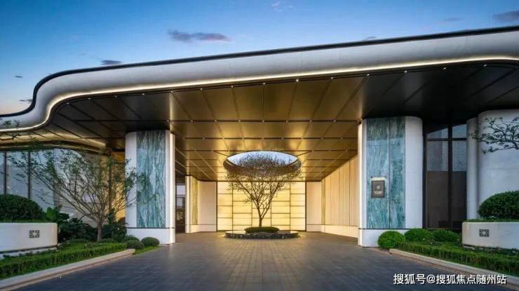 高度达到了约7米的端庄主入口大门,采用贝金米黄石材、维多利亚绿、白雪公主奢石,结合古铜色金属板,形成冷暖撞色的张力美学,打开了城市奢度,每个细节透露出“贵”,形镂空穹顶,池中植入紫薇,寓意福祉盈门。