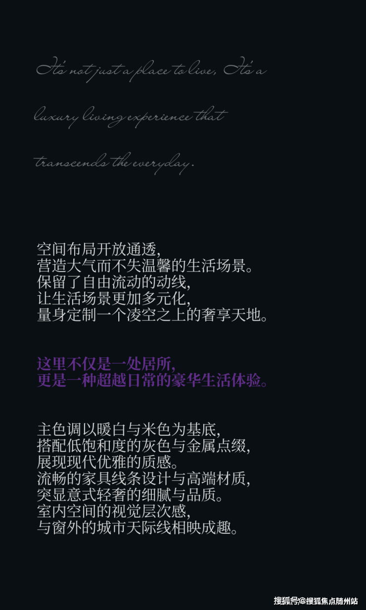户型特点:空间布局合理,设计独具匠心,如230平方米的“钻石”三房户型和420平方米的“超跑”四房户型,都复刻了兰博基尼跑车的楔形空间,大幅全景落地窗让业主尽享城市美景。