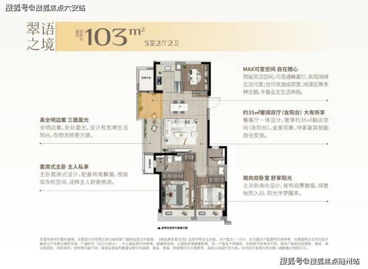 建面约103㎡的边套更是堪称神迹,将小户型的空间魔法玩到了极致。客厅到阳台的地面、天花直接拉通,甚至两侧的墙垛都已隐身,整个餐客厅面积达到约35㎡(含阳台),这可是140㎡以上大宅才有的空间感!