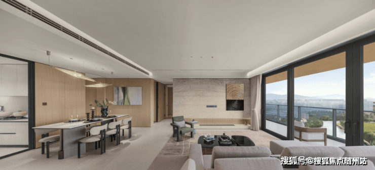 餐客厅全落地转角设计,同时连通圆弧形阳台和设备平台,形成约270°、约30米的超长景观面!