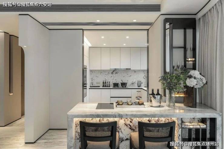 室内甄选古奇黑玄关石、芬迪白主厅大理石、孔雀开屏艺术墙等全球珍稀石材,每一处细节均如艺术展陈。地面铺装奥地利灰大理石,墙面运用维纳斯灰石材,营造自然松弛的氛围。