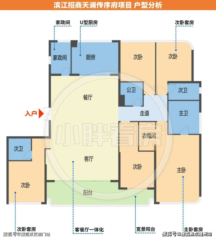 整体客餐厅南北通透,带有家政间,光从户型图来看入户无独立玄关,两梯两户的情况下,其实也可以把鞋柜等做到门口,或者视客餐厅尺度而定打造玄关柜。