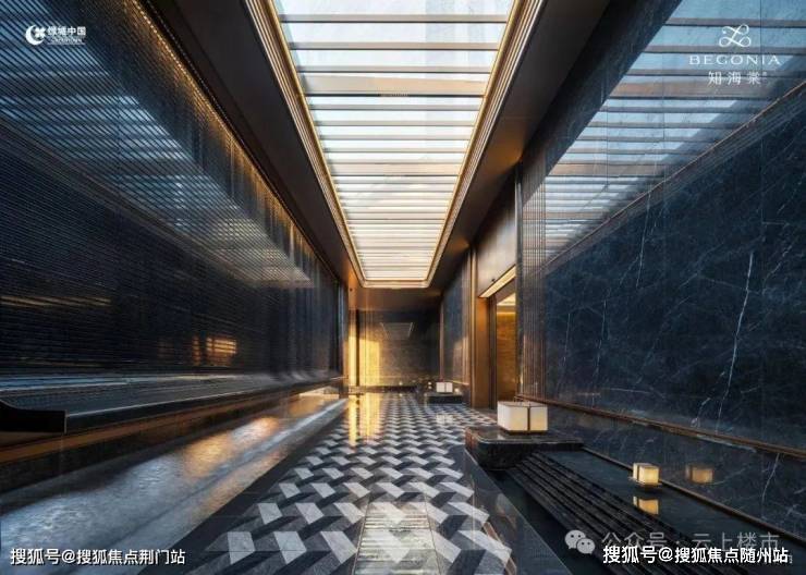 站立于台地之上,知海棠水景沿土地形态形成瀑布、镜面、溪涧等多重形态,浮岛客厅处设置休憩卡座,与前厅形成光影对话,如同三潭印月一般,映于湖心之上,抬高的湖心亭设计,成为舒展园区的一道风景线。
