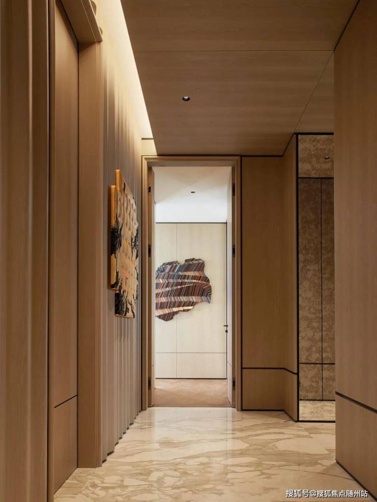 从高档材料的运用到开放式的空间布局,全屋奢石通铺,入户门厅匹配的是纹理低调的超白洞石搭配定制尺寸卡门,一眼看去,安全感满满。