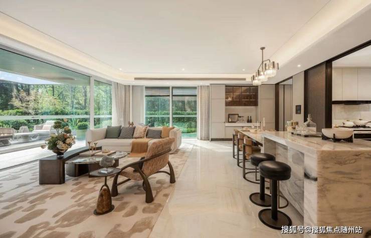 「臻墅」还是精装修交付的,而且很豪华很有诚意,像客餐厅大尺度的餐边柜,客厅地面、墙面的大理石,还有主卧房间的全系统衣柜,都做好了。