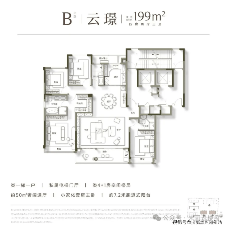 • 199㎡云端大平层:四房三卫全套房设计,7.2米横厅+LDKB一体化布局,层高3.1米,电梯厅独门独户,南向双阳台实现“有天有地”的别墅级体验。