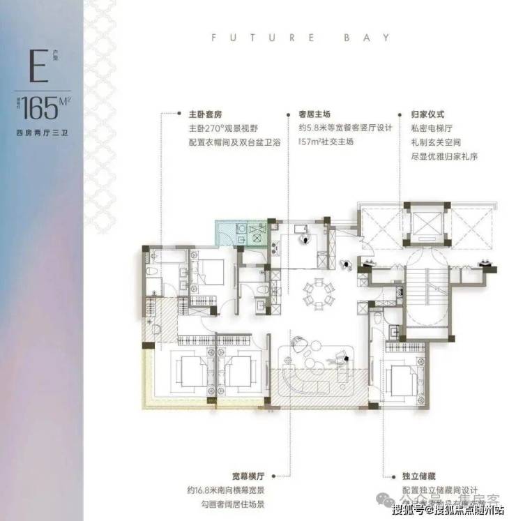 约165方户型,16.85米超大南向开间,超过市场所有同面积段产品;标配储藏间。