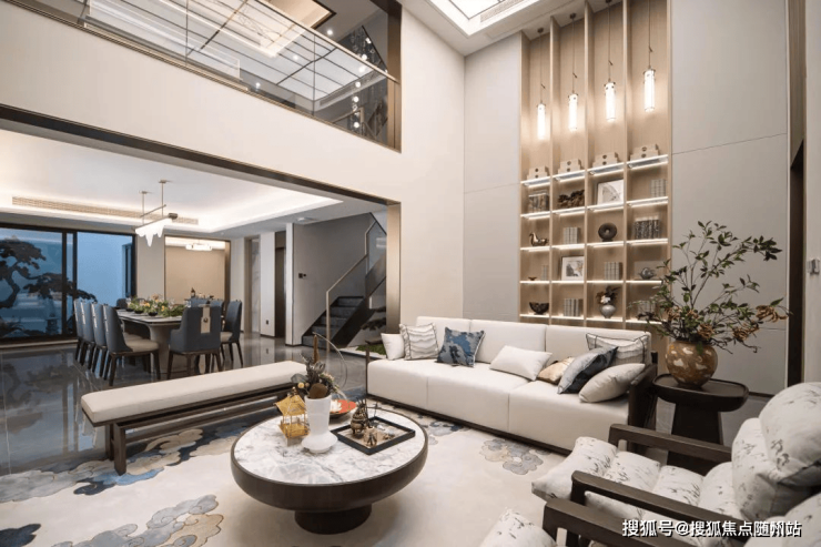 摆上一组沙发,或静坐闲读,或花园晚餐,或邀三五好友欢聚,都有一种悠然自得的安定感。长面宽、短进深格局来到室内,一楼层高约3.4米、面宽约7米大横厅霸气十足,搭配大面落地窗,阳光清风肆意涌入,将室内映衬的一片明亮,毫无阴影死角。