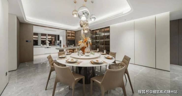 在餐厅,雲玺设置了一座长约2.4米的艺术岛台,白金沙天然石材配以金属底座,加之弧线的边角设计,弱化了封闭式岛台的厚重感,也更符合人体工学设计。