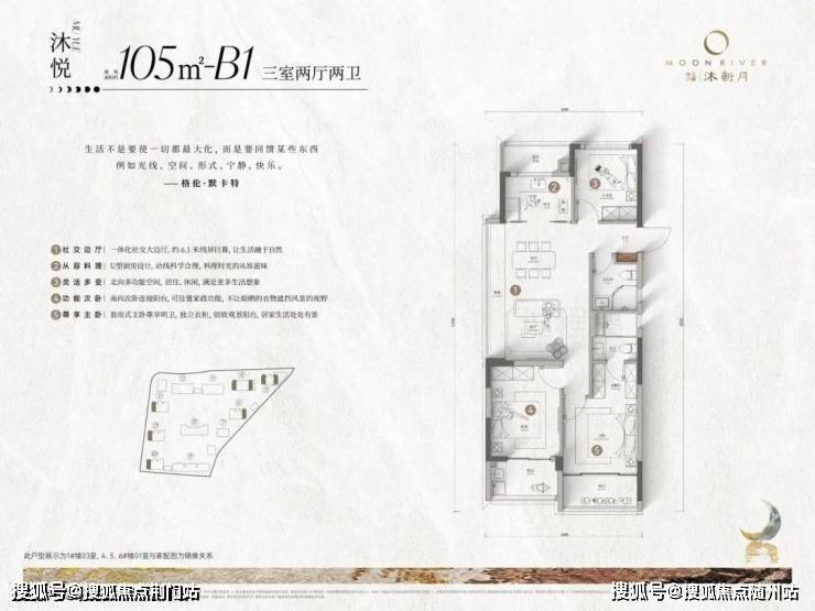 约105㎡有两款,我称之为“横竖双王炸”:一款是“四开间南小户型”,每个房间都向阳,还是准双套房。另一款是少见的边套小户型,自带约6.1米大边厅。