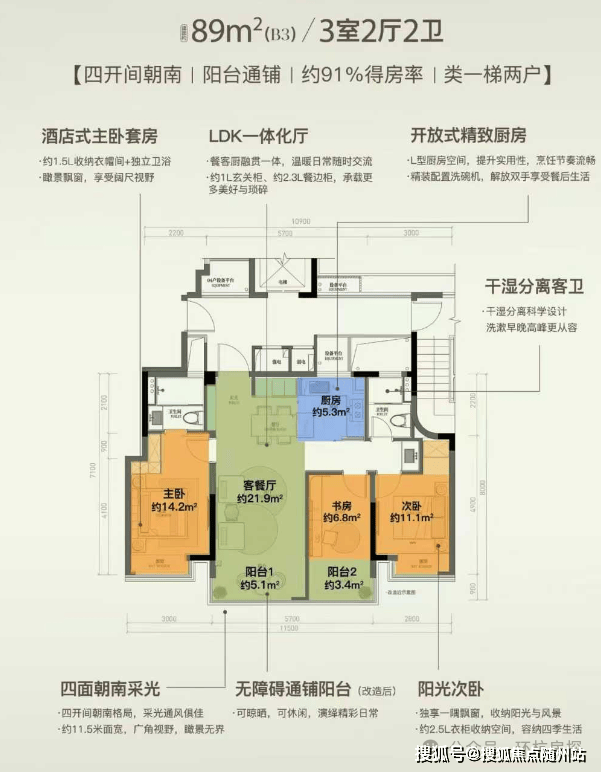 滨润锦翠城的主力户型为76-139平方米,覆盖了刚需和初步改善需求。其中,89平方米的户型做出了“四开间朝南”的设计,南向面宽约11.5米,保证了室内的采光和通风。