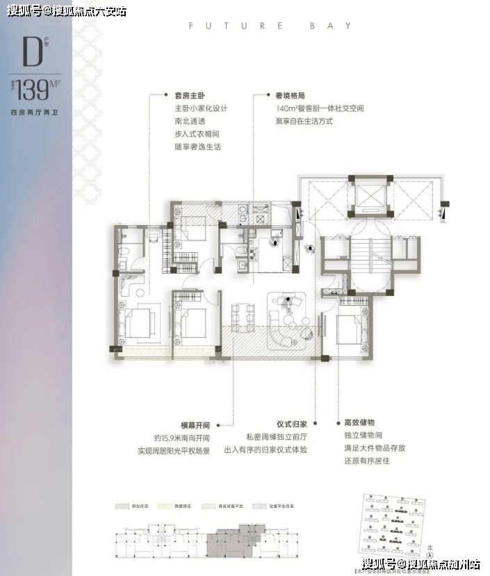 建面约139㎡户型:四房两厅两卫:约15.9米南向面宽,近五开间朝南,采光通风极佳。有三南卧设计且动静分区,老人房与主卧分设客厅两侧,避免相互干扰,还标配入户储藏间。此外,约6.4米阔尺横厅,餐客厅一体,可摆放8人餐桌。