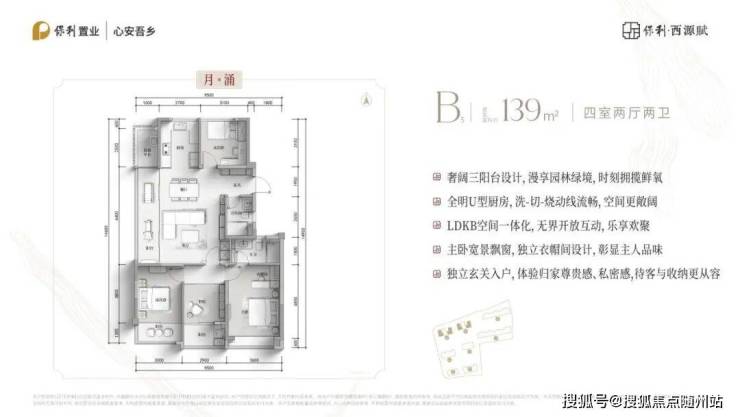 建面约139㎡户型,三阳台设计,呈现270°无界视野,尽揽天光云影;LDKB一体化空间联动,会客、餐叙、休闲自在流转;主卧尊享套房配置,私密与尊崇并重。