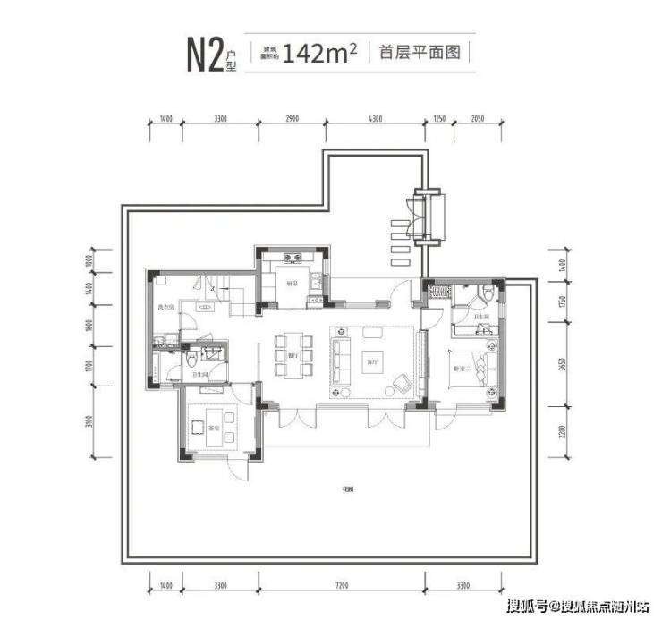 142㎡户型为例,面宽约15.2米,标准4房4卫。一楼是约7.2米长的双面采光大横厅,除了老人套房,还有个向院子伸出的“X空间”。
