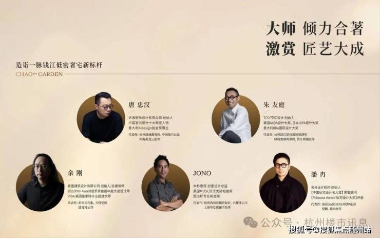 力邀近境制作创始人唐忠汉、TCD²平仄设计创始人朱友庭、木杉景观创意总监JONO、名谷设计创始人潘冉、青墨建筑设计创始人余刚5位设计名家重磅携手。集匠艺之大成,共筑金沙湖当代奢宅新标杆。