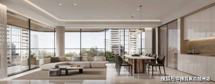 餐客厅全落地转角设计,同时连通圆弧形阳台和设备平台,形成约270°、约30米的超长景观面!