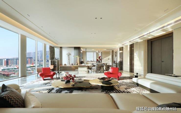 项目标准层高4.2米,26层顶楼高达4.8米,通过全景落地窗将运河天际线引入室内,重构空间尺度与视觉美学。区别于传统大平层,项目以“社交场域”为设计导向:26层顶层规划空中会客厅,标准层配置可变空间布局,满足商务宴请、艺术展览等多元需求。
