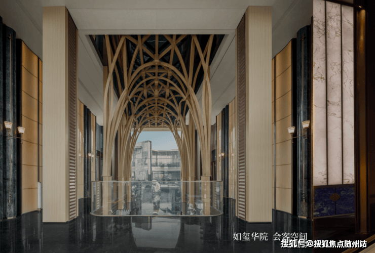 在如玺华院,入口处以“迎宾水景+景墙”组合,模拟宋代园林“叠石理水”手法,两侧点缀造型黑松,第一眼便获得尊崇感。挑高约12米的归家大堂,榫卯结构的高大穹顶,让人感受到中式建筑的千年智慧。