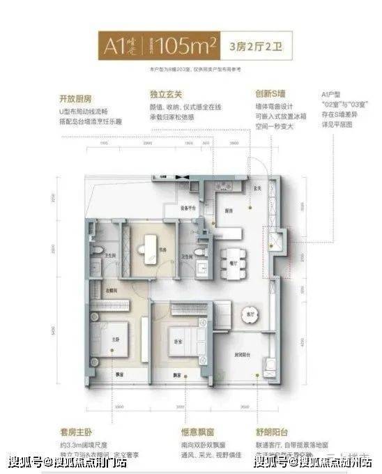 作为入门户型,105㎡(A1 户型)定位 “小两口奔赴新生活的”,却在空间利用上做到了 “小而精”。独立玄关搭配 “800 库”,轻松藏起雨伞、鞋盒与换季杂物,归家即见整洁。开放式厨房采用 U 型布局,搭配岛台设计,既保证烹饪动线流畅,又能作为家庭互动的 “社交核心”。创新 S 型墙体设计是一大亮点,不仅实现嵌入式冰箱放置,更通过弯曲造型提升空间利用率。