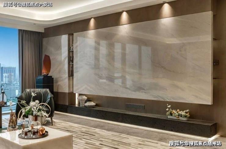 在客厅,有足足约5.1米宽的白金沙石材背景墙,地面为爱马仕灰石材通铺,天然的石材,自然的纹理,以及被奢牌严选的经典色调,是经由雲玺设计师百般甄选后的审美表达,致力于以真材石料的本真质感,传达本真的美感。