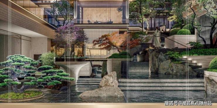雲润宸庐的约2000㎡中央会客厅,融合书吧、茶室、儿童游乐区等功能,意图构建有温度的“宋韵社群”。整个会所围绕落差超9米的中庭展开,以西湖郭庄为范本,再现了“水、石、松、廊、桥、亭、轩”等经典元素。