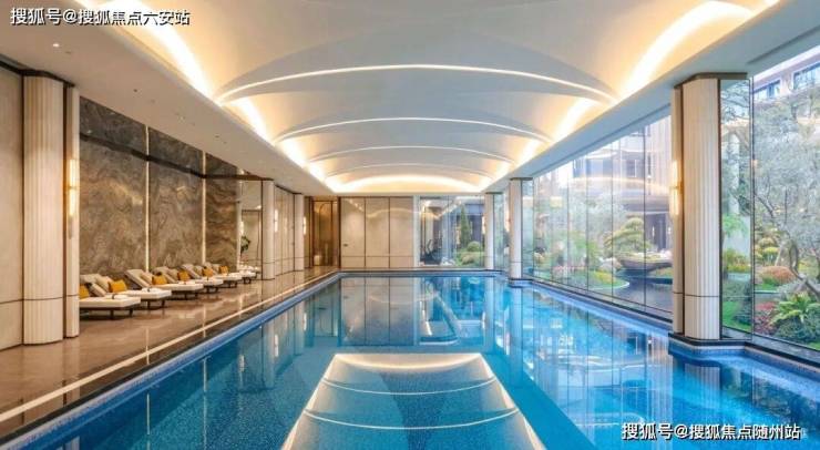 连着下沉式庭院的会所,有恒温泳池、会客厅、健身房、瑜伽室,设计规格和庭院一样隆重,墙面地面用了大量隆重的奢石。