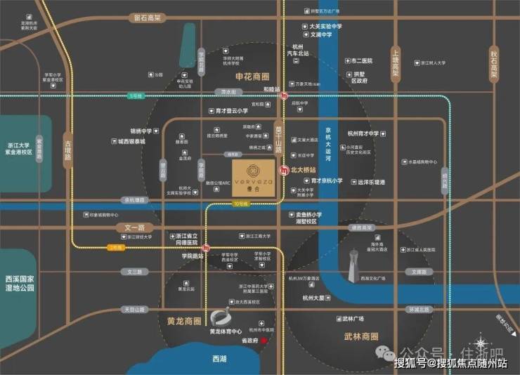 缦合Verveza坐落于杭州拱墅区申花板块核心位置——莫干山路与月亮路交叉口,坐拥“大悦城上盖+运河生态”双重稀缺资源。这一区位不仅承载着杭州城市发展的战略转向,更汇聚了城市顶配资源。