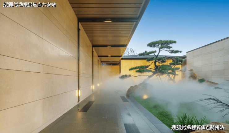 大门取意宋代二坡顶形制,整个大门约43.8米宽、约9米高,约16米进深,气场拉满。在沉木米黄景墙里,嵌入18块价值百万的透光奢石,古朴肌理与苍劲造型松形成“石木对话”。
