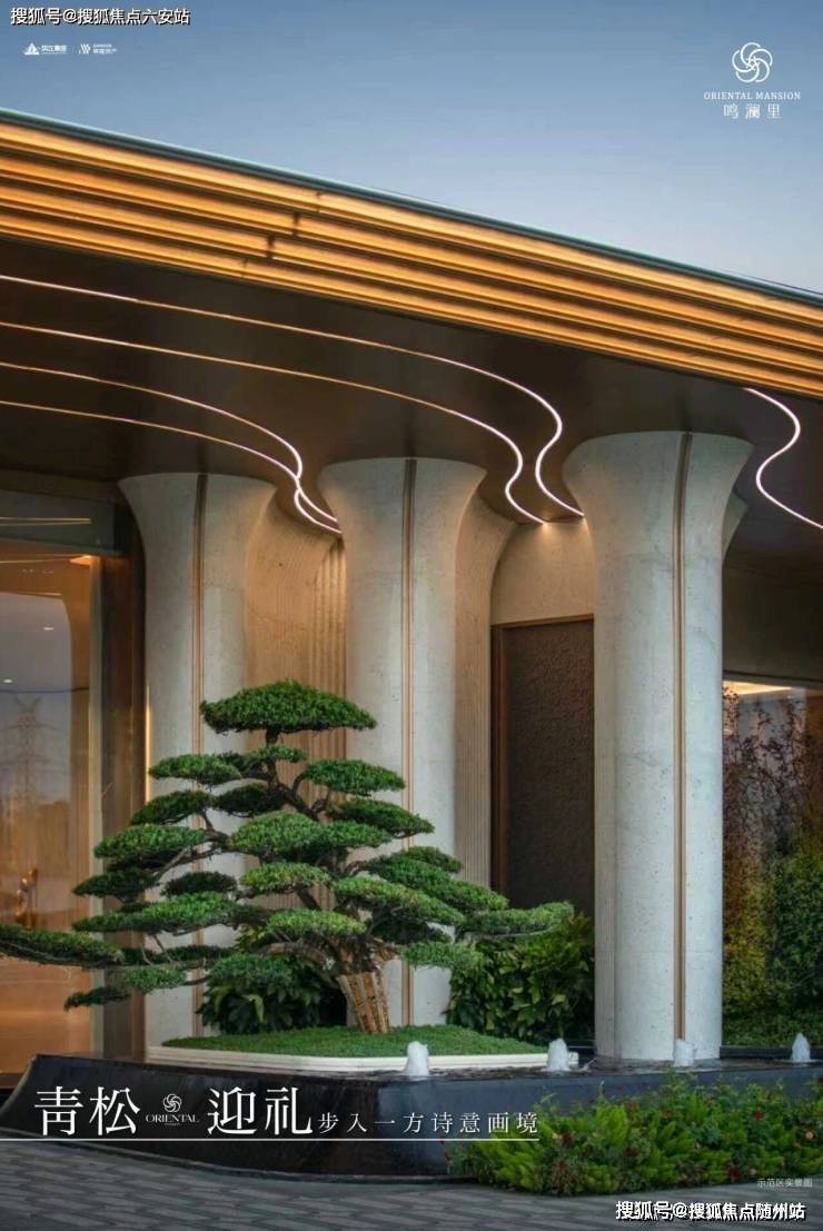 门前两棵罗汉松;园区内的中央园林围绕新型蓝宝石戏水池打造,营造澜韵迎宾、松鸣涧语、鸣泉叠韵、鸣芳拾趣、鸣香径幽等九境空间。