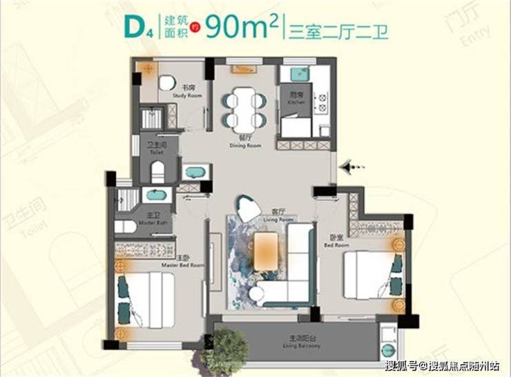 2. 90㎡三房两卫:飞机户型,南北通透双阳台