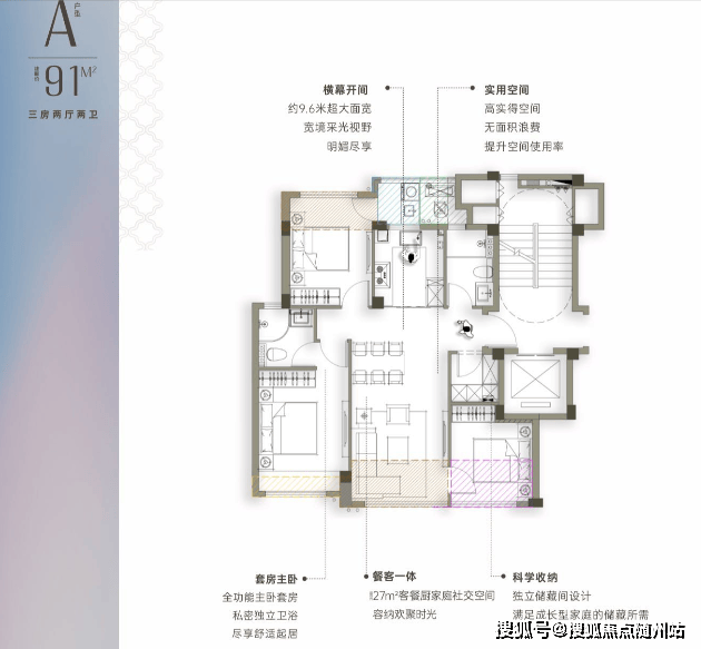 户型面积段为91㎡、108㎡、125㎡、139㎡,得房率最高96%。