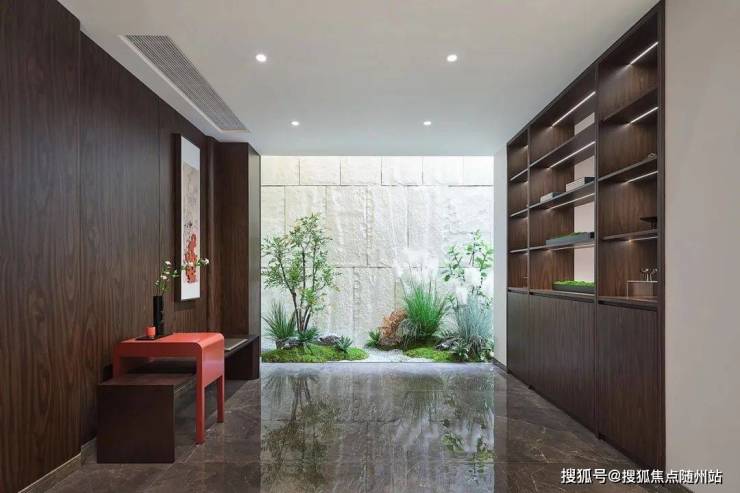 建筑外观采用瓦白墙,有檐口、屋脊的形制,展现了新中式风格的韵味。“景观大师”贝尔高林以“新中式园林”为主题,龙坞山水诗画生活情境为基底,借茶之精髓将内庭院墙、山石松色、镜水碧波融入到溪映听庐这一东方雅境之中。