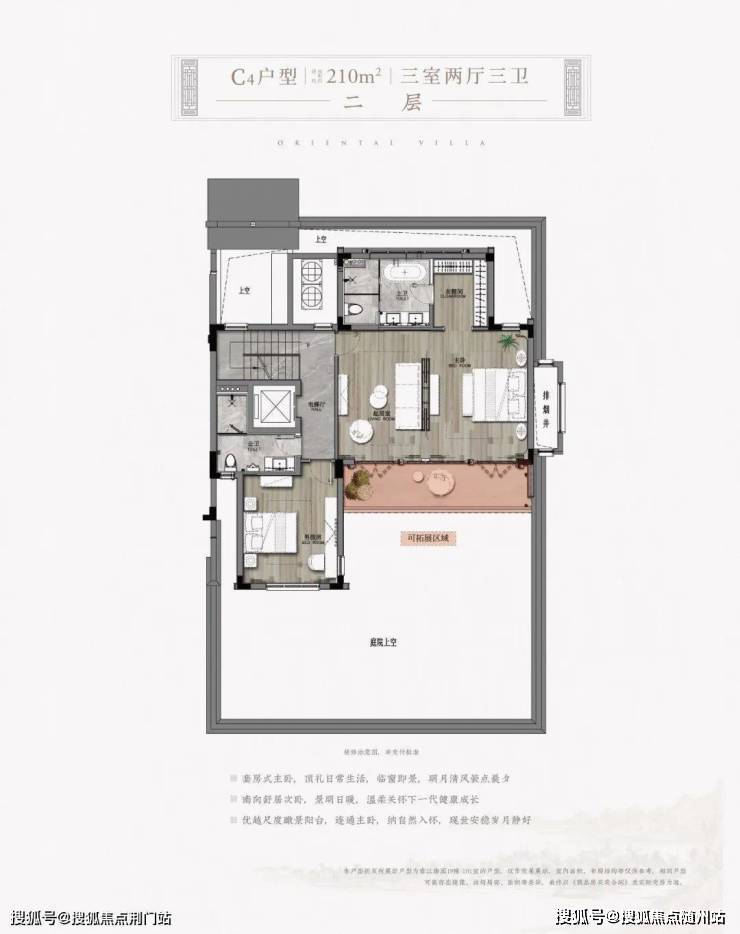 创新“2+2”空间格局。香溢·春江御园的主力户型涵盖170平方米至330平方米的中式合院,全部采用“地上两层+地下空间”的创新格局。每户均拥有50-100平方米的私家庭院,部分户型庭院面积甚至更大。