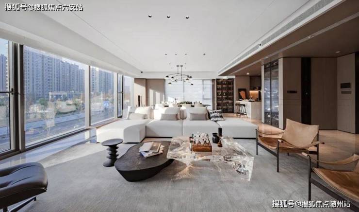 携手国际设计团队,以“云端云影”为灵感,外立面采用流线型玻璃幕墙+香槟金铝板线条,打造建面约310-340㎡精装平层。3.4米层高、270°环幕曲面窗揽城景,主厅演化成U形双转角落地窗,如IMAX巨幕环抱城市天际线,获评“中国建筑工程装饰奖”。